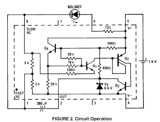 typical 1.5V LED flasher, but with the internal circuitry of the IC