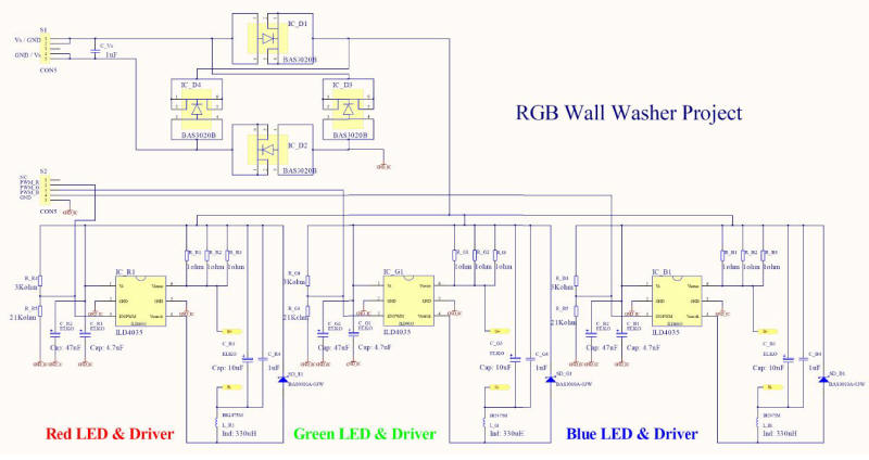 The circuit consists of 3 LED drivers – ILD4035 which can drive