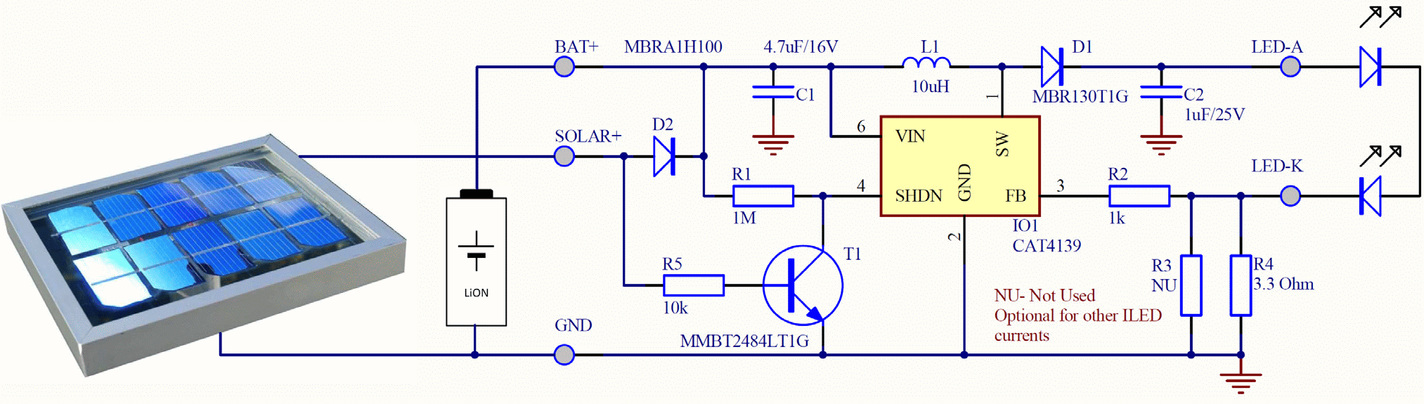 The goal of this work was to create most efficient constant current boost driver operational from single cell Li−Ion battery recharged from solar module. Savings and the environment quality are a concern. This solar LED circuit diagram describes implementation of the CAT4139, a dc−dc step−up converter that delivers an accurate constant current for driving serial LED string in solar LED lamp.