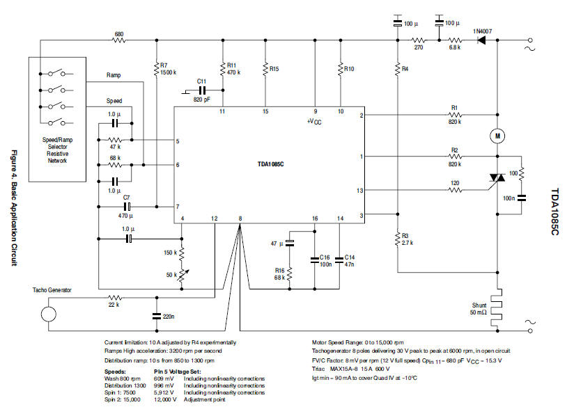Universal Motor Speed Controller The TDA1085C is a phase angle triac controller having all the necessary functions for universal motor speed control in washing machines. It operates in closed loop configuration and provides two ramp possibilities.